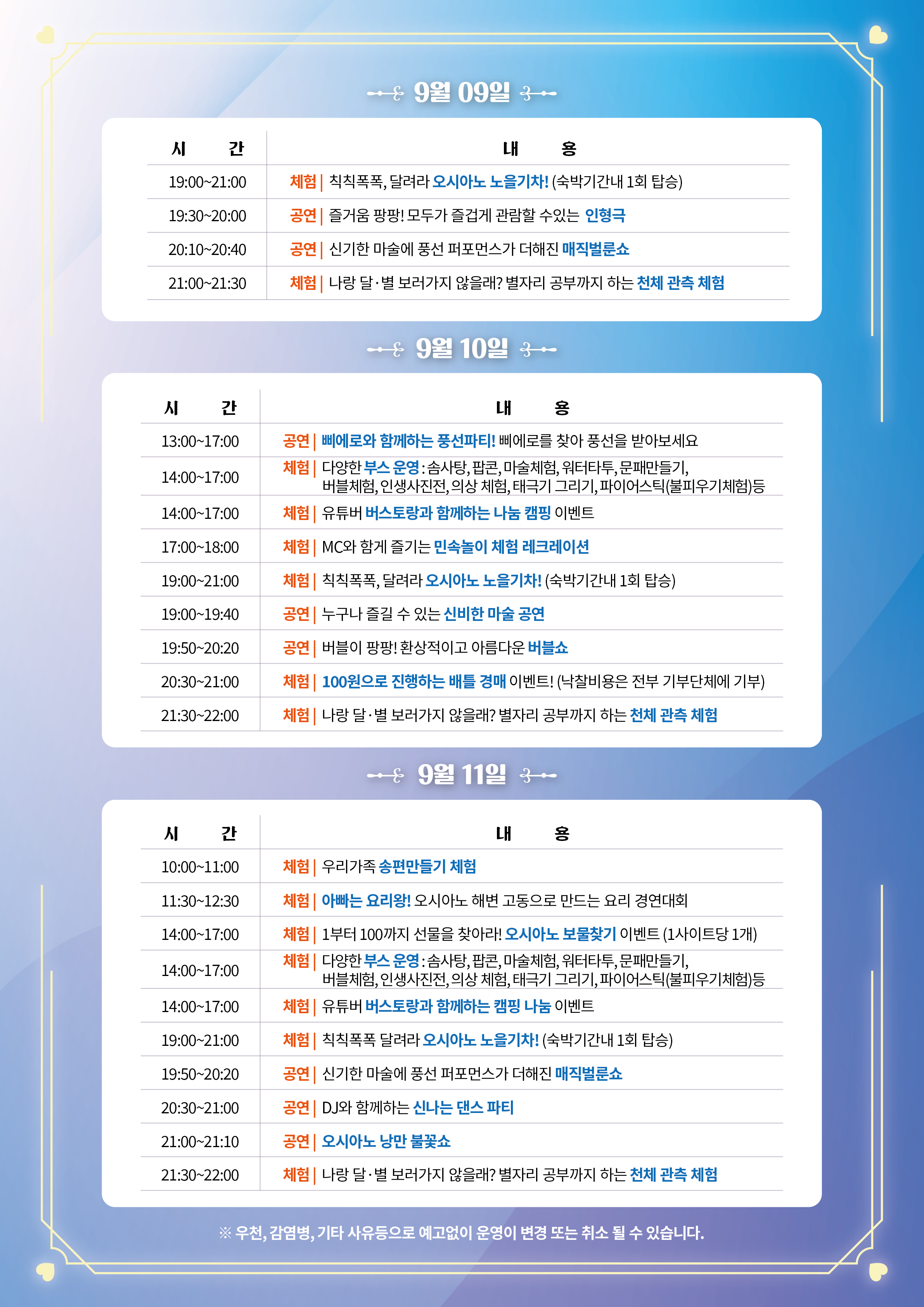 Äڷγª·Î ÀÎÇØ ÀáÁ¤ ÁߴܵǾú´ø ÇØ³² ¿À½Ã¾Æ³ë °¡À» ³¶¸¸ Ä·ÇÎ Æä½ºÆ¼¹úÀÌ 2022³â 9¿ù 9ÀϺÎÅÍ 11ÀϱîÁö °³Ãֵ˴ϴÙ.